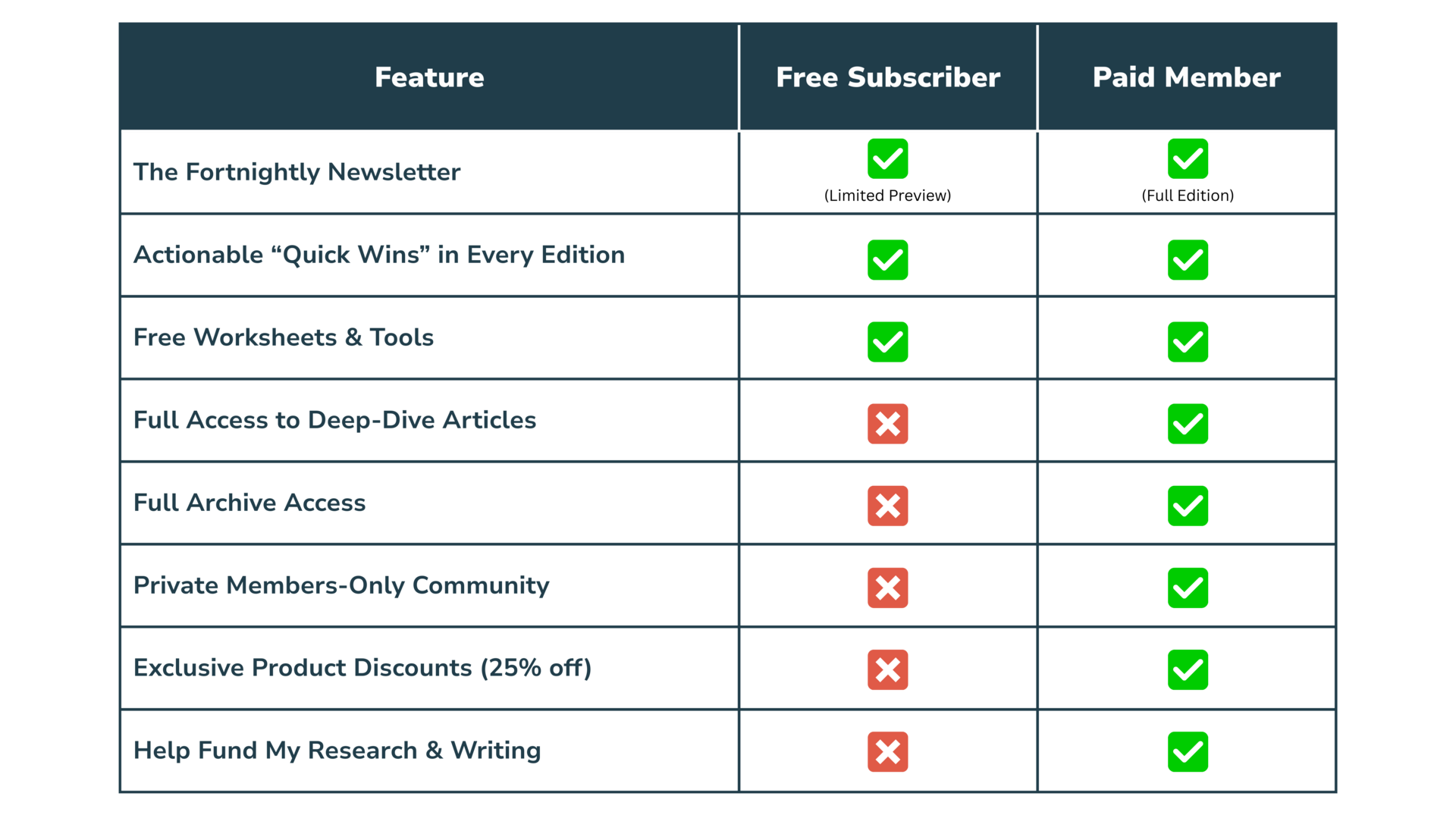 Becoming a paid member is about moving from being a reader to an active participant in your own growth. It's a small, powerful investment in yourself. Here’s what you get when you join: